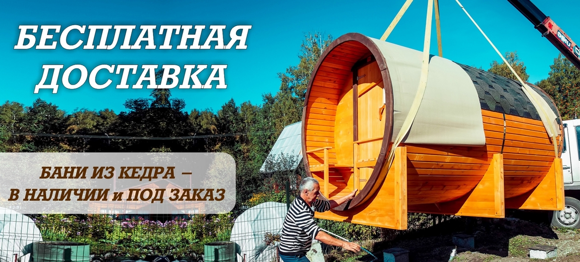 Закажите любую баню-бочку или каркасно-щитовую баню из кедра прямо сейчас, внеся всего 50% от стоимости, -  получите доставку готового изделия со скидкой до 100%!