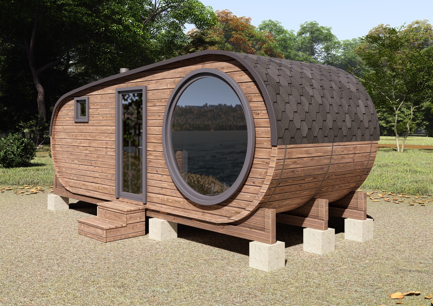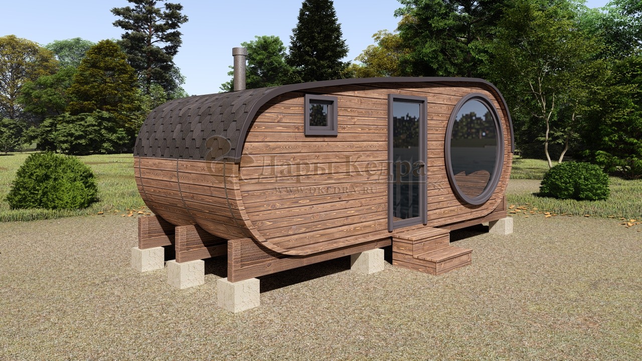 Внутри бани создается ощущение простора, позволяя разместить более широкие полки, удобные скамьи и даже полноценную комнату отдыха. Овальная форма обеспечивает более эффективное распределение пара и тепла, создавая идеальный микроклимат для парения. Возможность бокового входа также расширяет варианты планировки и установки на вашем участке.